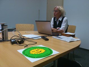 シュラーゲンさんは木の枝でデータを差し示しながら、熱を込めて環境問題を論じる。まず、私たちが訪問した前日の新聞記事を披露してくれた。それは大手電力会社のRWEが、採算が取れないとしてついに原子力発電から撤退するという象徴的なものであった。そしてシュラーゲンさんは、EWSはいよいよ市民運動から、本格的な事業の中に入っていくことにより、環境保全の実を上げることを宣言された。
