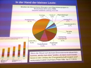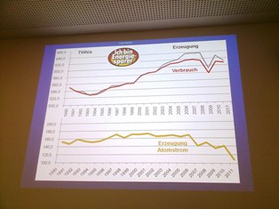 シュラーゲンさんによれば、EWSは主に、原発に頼らない、水力発電によるノルウェイの電力を調達し配電している、水力など分散型の電源の方がむしろ安定的であり大停電などのリスクを回避できる、さらに2000年から導入された電力会社による電力の全量買い取り制度によって、太陽光や風力、ガスコージェネなどの新たな電源が生み出されつつあり、こうした細かな電源を集めて調達するEWSの方が、原発に頼る大手電力会社の電気よりあらゆる条件において安価になっているとのことである。また、ドイツの電力供給の全体を見ても、原発の割合が減った分、化石燃料の使用が増加することもなく、再生可能エネルギーの割合が増加している。