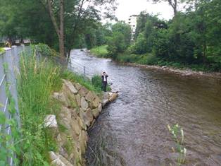 フライブルクの中心街から車で30分、黒い森が迫った緑の中を流れるドライザム川に設置された小水力発電所を視察した。フライブルク市経済観光公社の篠崎誠さんに案内、説明いただいた。フライブルクはライン川の支流であるこのドライザム川沿いに発展した街である。12世紀に街が作られた折、時の領主がこの川の水を街に引き込み、農業、牧畜業の発展の糧とし、火災への備えともしてきた。第二次世界大戦による破壊後、街の再建がはかられる時に、この水路が活かされ今も中心街を流れ、街に潤いを与えている。
