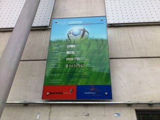 ドライザム川小水力発電所の岐路、時間に余裕ができたので立ち寄った。公式サッカー場としてはやや狭いものの、一面の緑が美しい。ここでも環境が全面に押し出されており、スタンド屋根全面に設置された太陽光パネルの現在発電量、延べ発電量が正面ゲート前に常時デジタル表示されている。