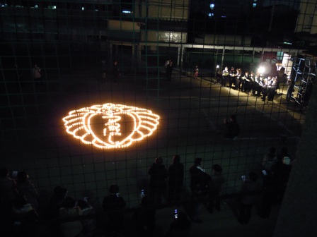やがて、700個にも及ぶろうそくが並び、取り壊される校舎の2階3階に上がって見てみると、見事な校章を浮かび上がらせました。