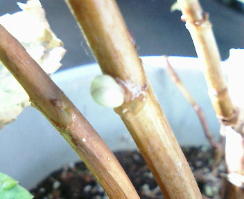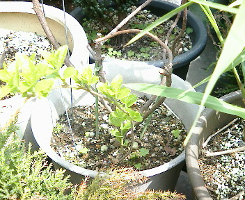 ウチのジュニア といっても昨年分けてもらったガクあじさい 新しい芽が育つ喜びは格別です |