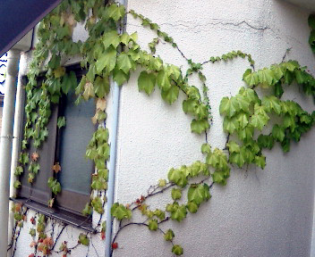 ツタの強さったら コンクリートの焼けた壁でも平気 しっかりつかんでます |